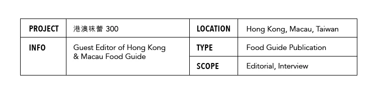 As Guest Editor working with the Taiwan Cite Media Group, we interviewed and visited 300 restaurants in Hong Kong and Macau to create a food guide.